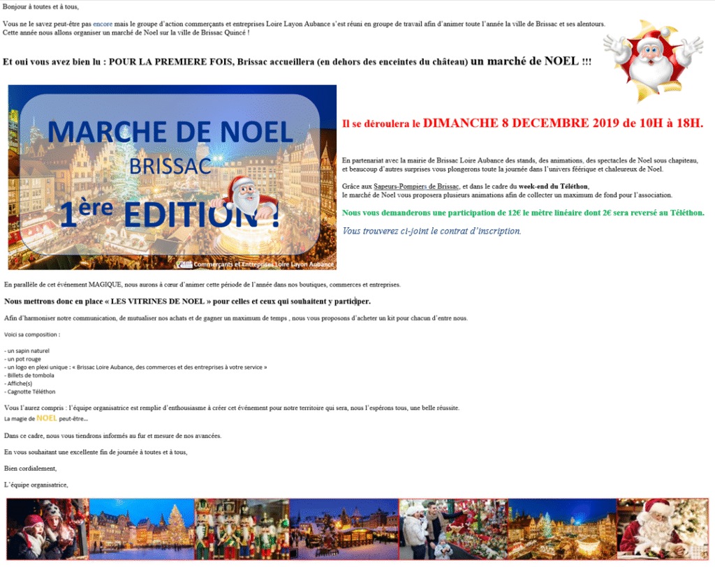Le groupe d’actions des commerçants et entreprises de Brissac Loire Aubance (CELLA) organise le marché de noël BRISSAC le Dimanche 8 Décembre de 10h à 18h – place du Général de Gaulle à Brissac. en partenariat avec Mairie de Brissac Loire Aubance et les Pompiers de Brissac (Stand Téléthon)